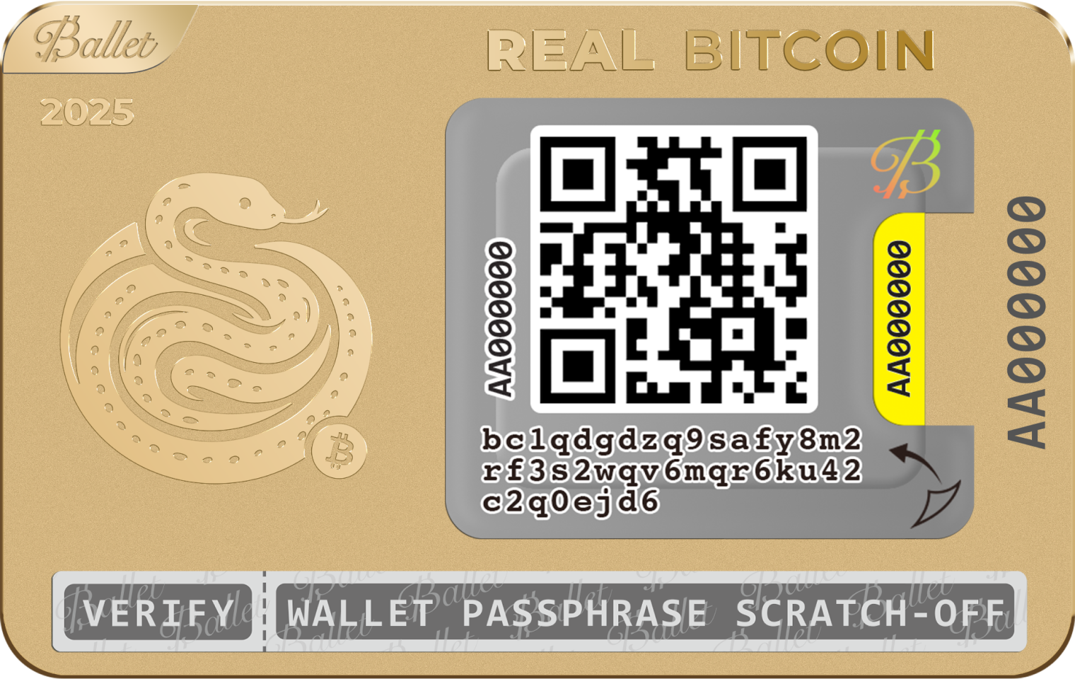The REAL Series cold storage also contains two hidden components that are required to send cryptocurrency out from the cold storage: an encrypted private key and a passphrase to unlock it. The encrypted private key is concealed under the deposit address QR code sticker. The 24-character passphrase is laser-etched onto the cold storage and concealed under a strip of lottery-style scratch-off material. When you want to send cryptocurrency out from your cold storage, you will need to peel off the QR code sticker to reveal the encrypted private key and remove the scratch-off material to reveal the passphrase.