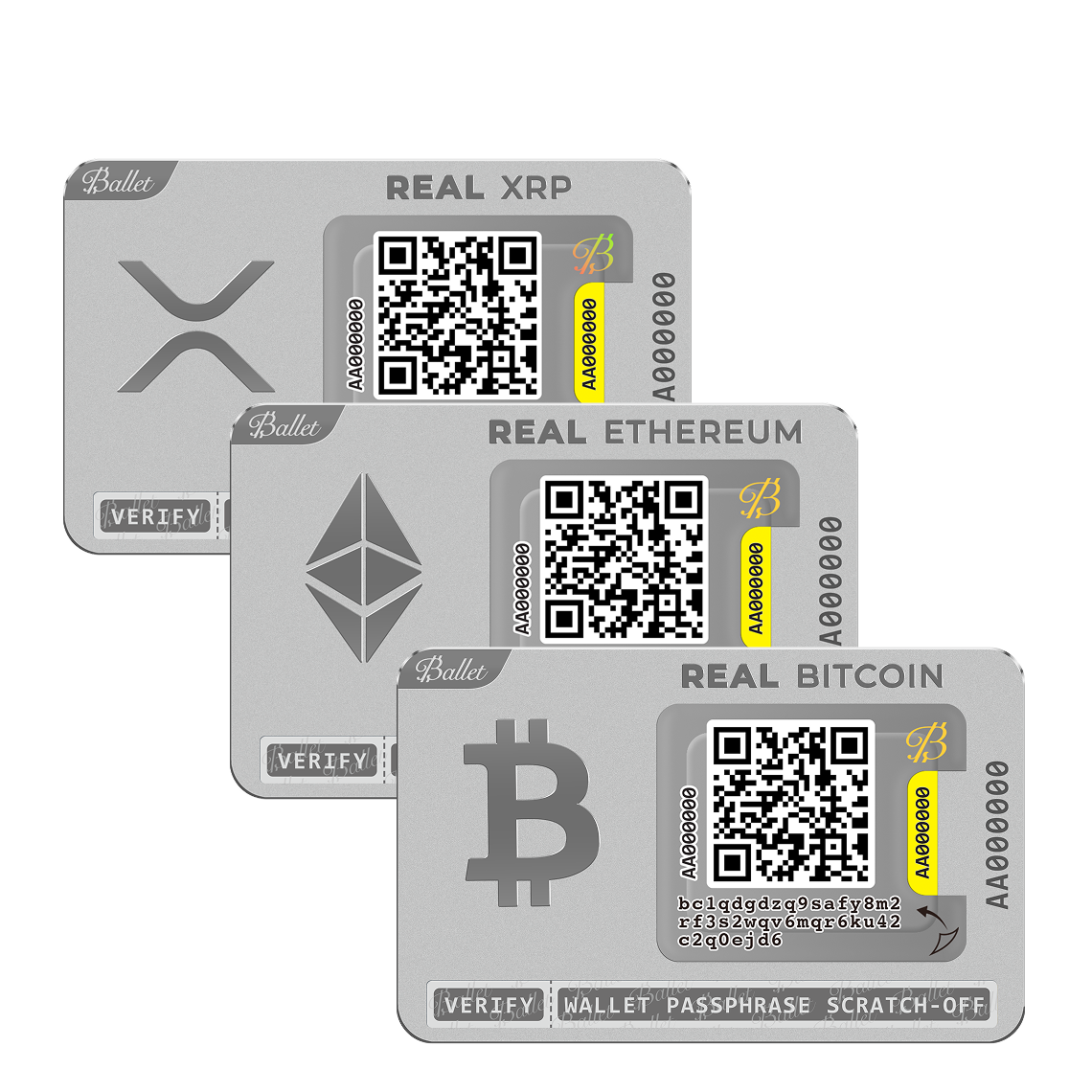 This bundle includes 3 stainless steel REAL Series Cold Storage cards: 1 REAL Bitcoin, 1 REAL Ethereum, and 1 REAL XRP.