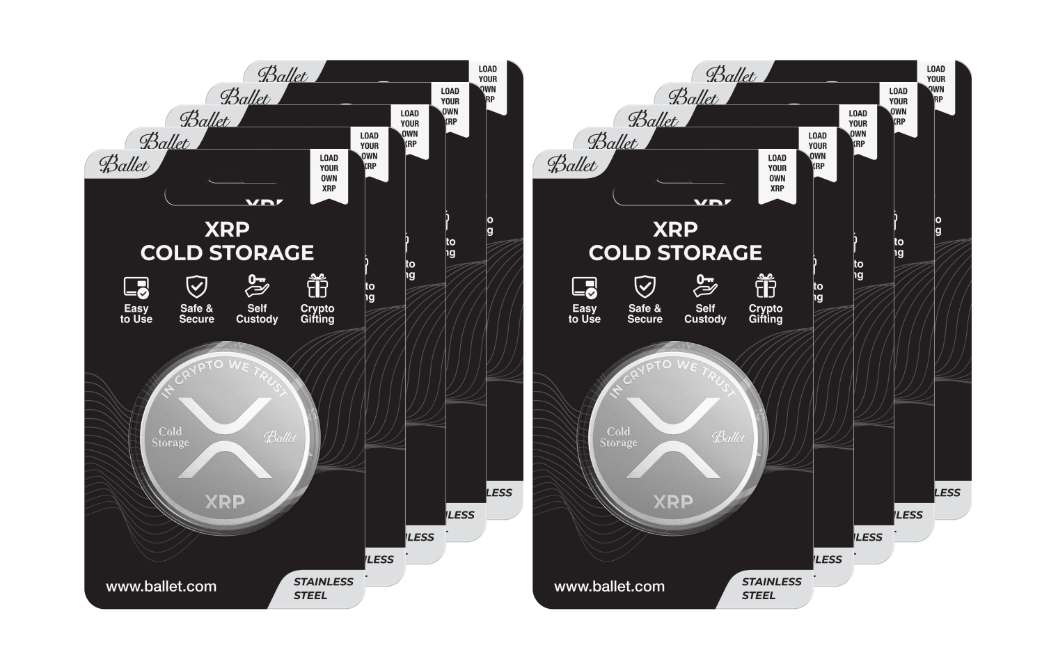Ballet Cold Storage Coins are each designed exclusively for Bitcoin or XRP. For multicurrency storage, explore Ballet REAL Series Cold Storage Wallet, which supports 1,000+ cryptocurrencies and NFTs.