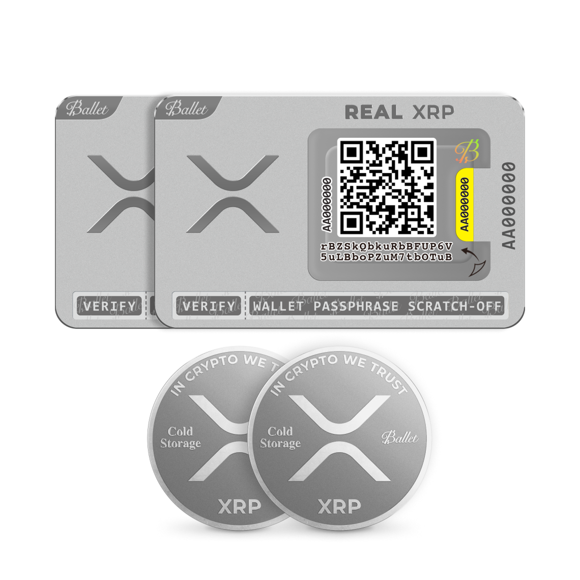 The easiest way to begin your crypto journey. This bundle includes 2 REAL XRP Cold Storage cards* and 2 XRP Cold Storage coins.** Pair both with the Ballet Crypto app for a simple, easy way to store, buy, and manage your coins.